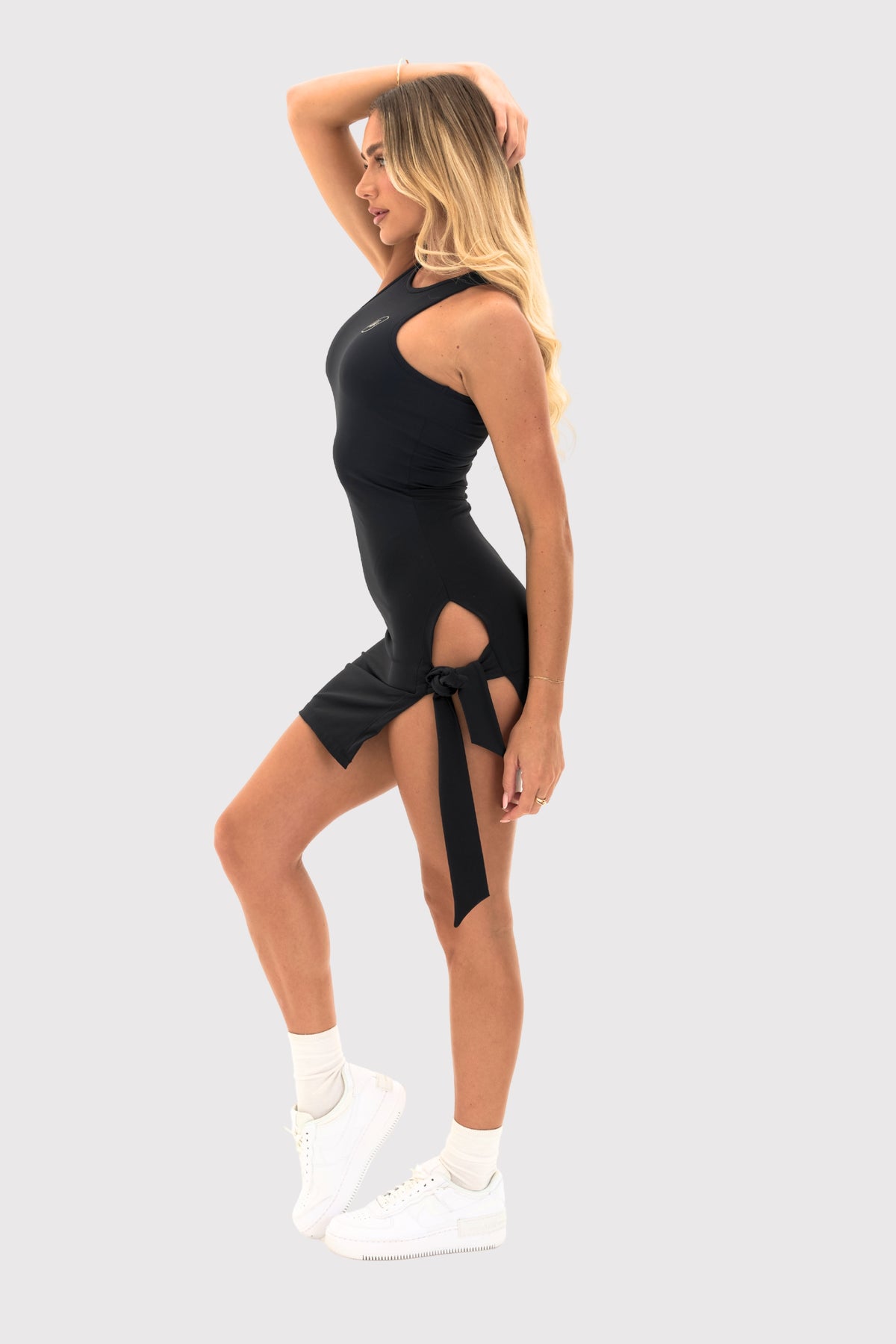We don't even need to say it, you already know we think you look good in the Flexara™ Racerback Side Tie Bodycon Mini Dress! We use moisture-wicking Flexara™ fabric that has great elasticity and gentle compression. It features an easy-to-move side slit on one side, above-the-knee length with a sleeveless design. Perfect for parties, date night, or when you just want all eyes on you.